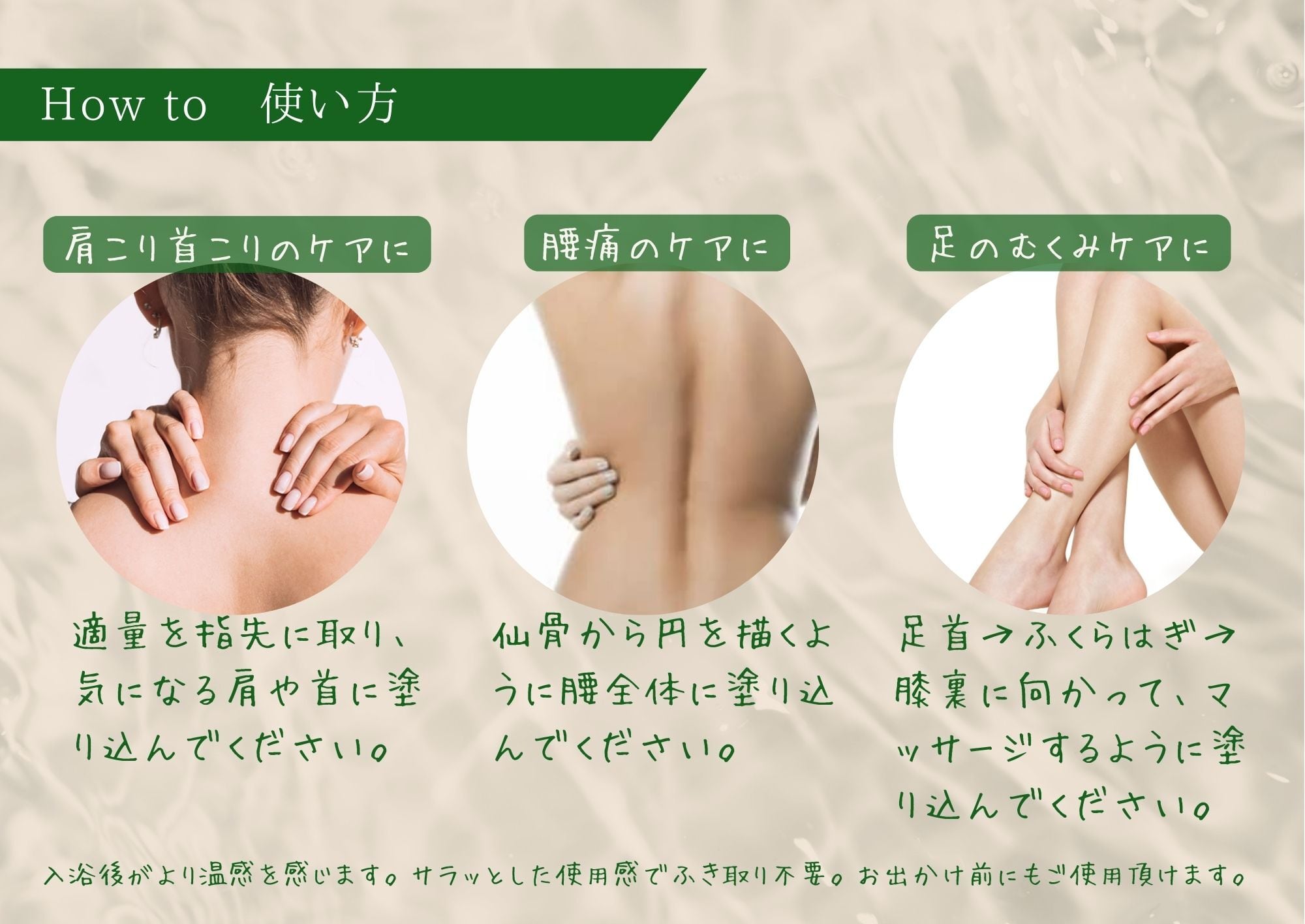 ◎入浴後、ほんの少量を首の後ろや肩に塗るだけで、ずっとポカポカ。湯冷めを防ぎます。温熱効果で血行促進。コリやむくみのケアに。