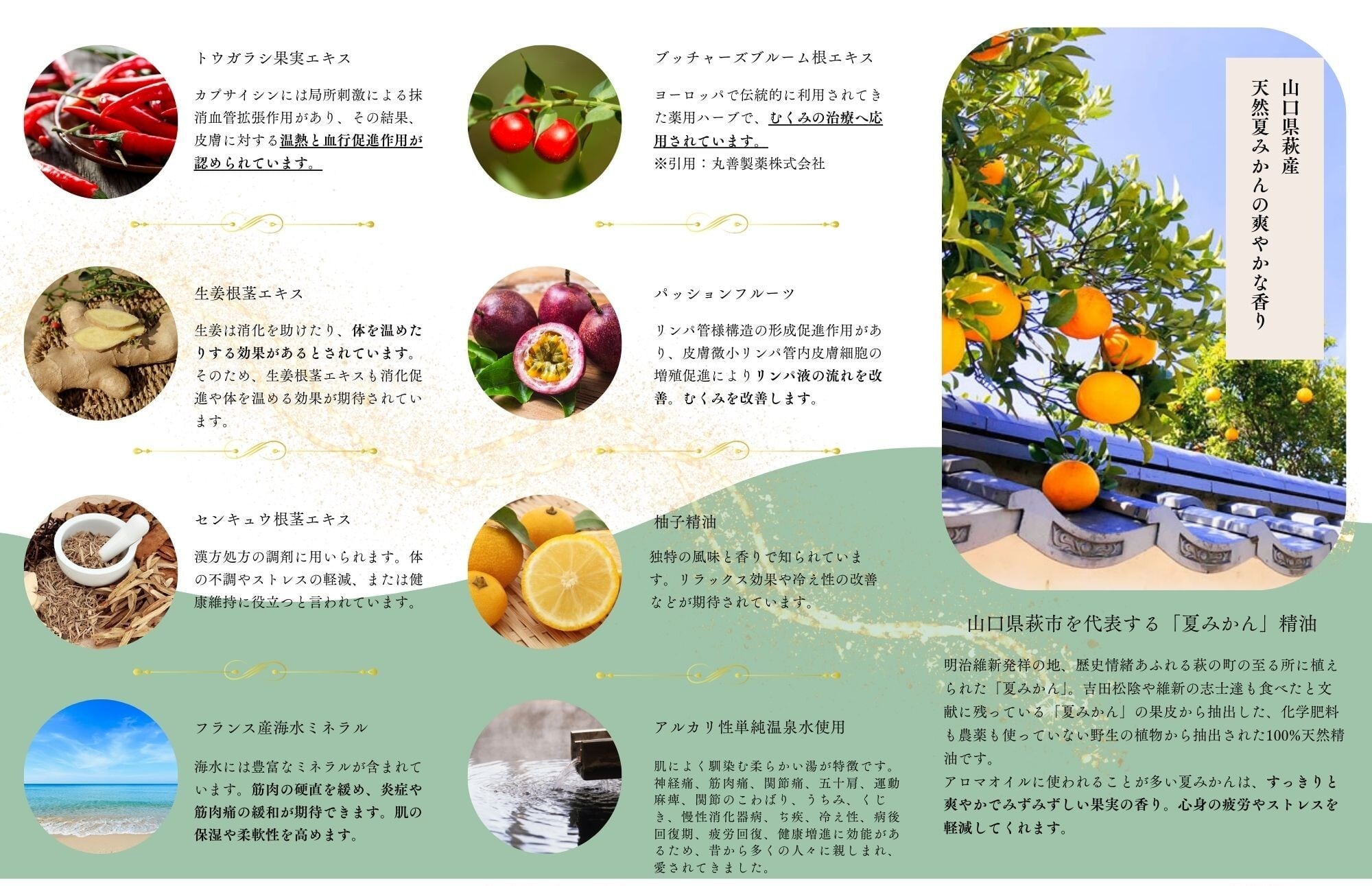 天然夏みかん精油と柚子精油。化学肥料・農薬不使用の植物から抽出したピュアな香りが、心までほぐしてくれます。